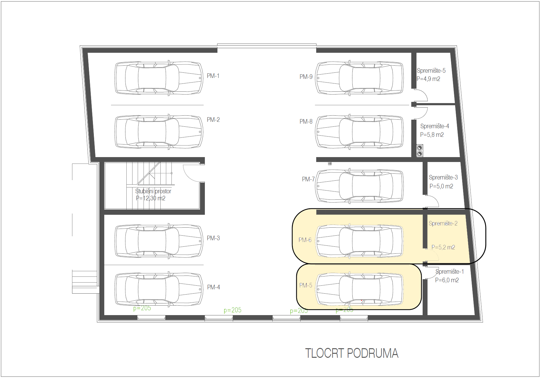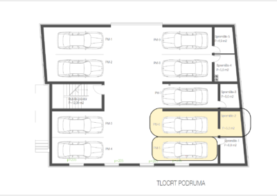 Stanu pripadaju dva garažna parkirna mjesta te ostava u podrumu od približno 6 m².